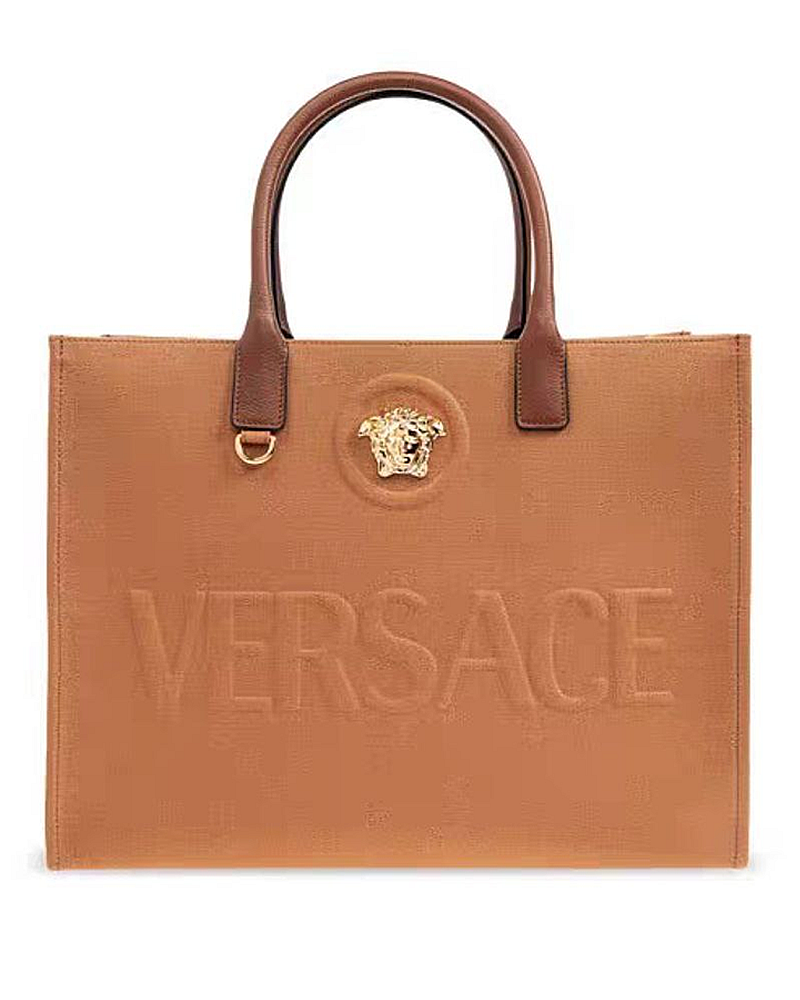 The LA Medusa Small Tote Bag is a versatile accessory combining refined style with practical design. Crafted from durable canvas and leather, it offers ample space for daily essentials without compromising on elegance. Its iconic Medusa plaque and embossed logo detail add a touch of luxury to your everyday look.